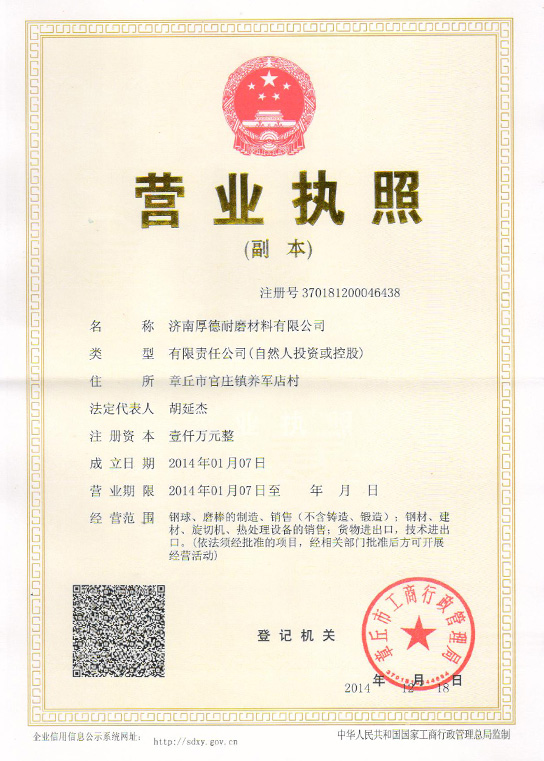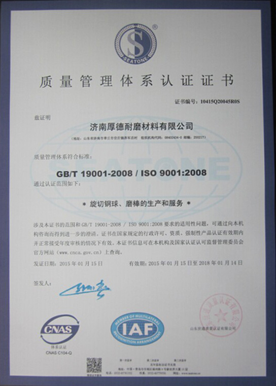 濟南厚德耐磨材料有限公司坐落于風景秀麗的山東章丘,毗鄰309國道,是耐磨鋼棒、耐磨鋼球生產出口廠家之一。公司擁有先進的生產設備,經驗豐富的技術人員,設計生產力年產6萬噸,產品各項性能指標均達到較高水平。公司已榮獲ISO9001-2000國際質量體系認證、IOS14001-2004國際環境體系認證等榮譽。
